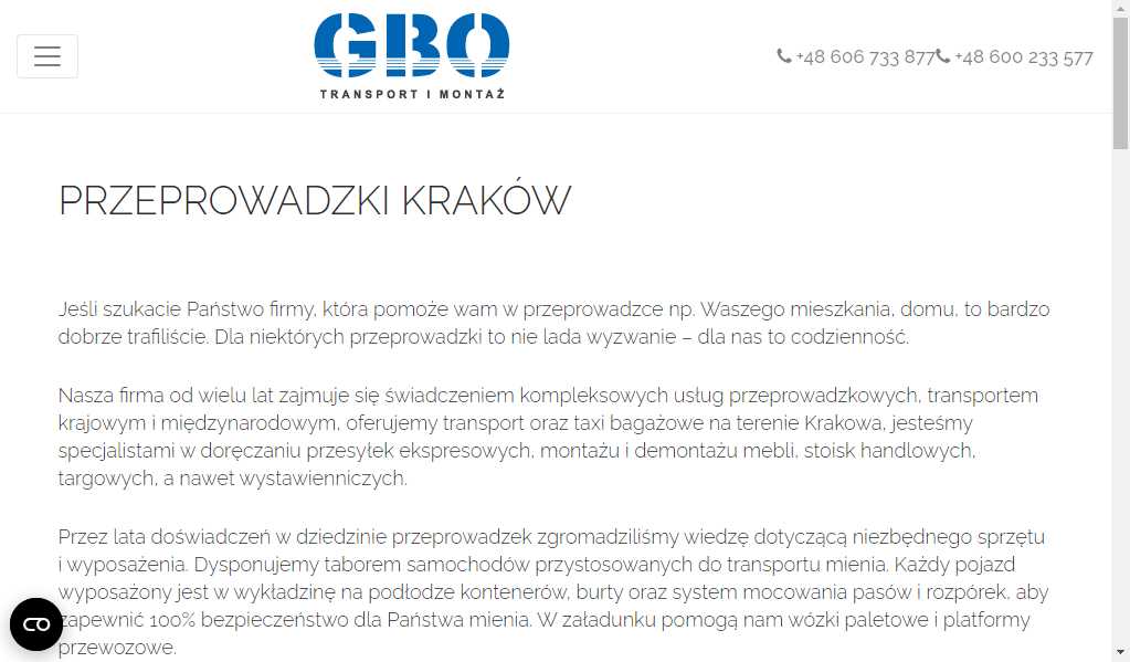 Przedsiębiorstwo GBO Transport oferuje profesjonalne usługi transportowe na terenie miasta Kraków. Dzięki wykwalifikowanym pracownikom oraz nowoczesnym samochodom dostawczym zapewniamy sprawny transport rzeczy osobistych w każdej sytuacji. Naszym priorytetem jest dokładność i indywidualne podejście do każdego zlecenia. Jeśli szukasz solidnej